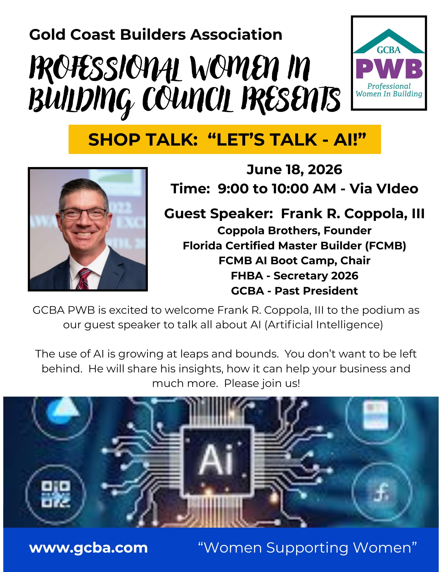 Please join us for our second Shop Talk of 2026. Our special guest will be Frank R. Coppola, III who is a leader with the FHBA known for his "Florida Certified Master Builder (FCMB) - AI Boot Camp" that he hosts three time a week. Join us as we learn more about AI and how it can support and help your business.