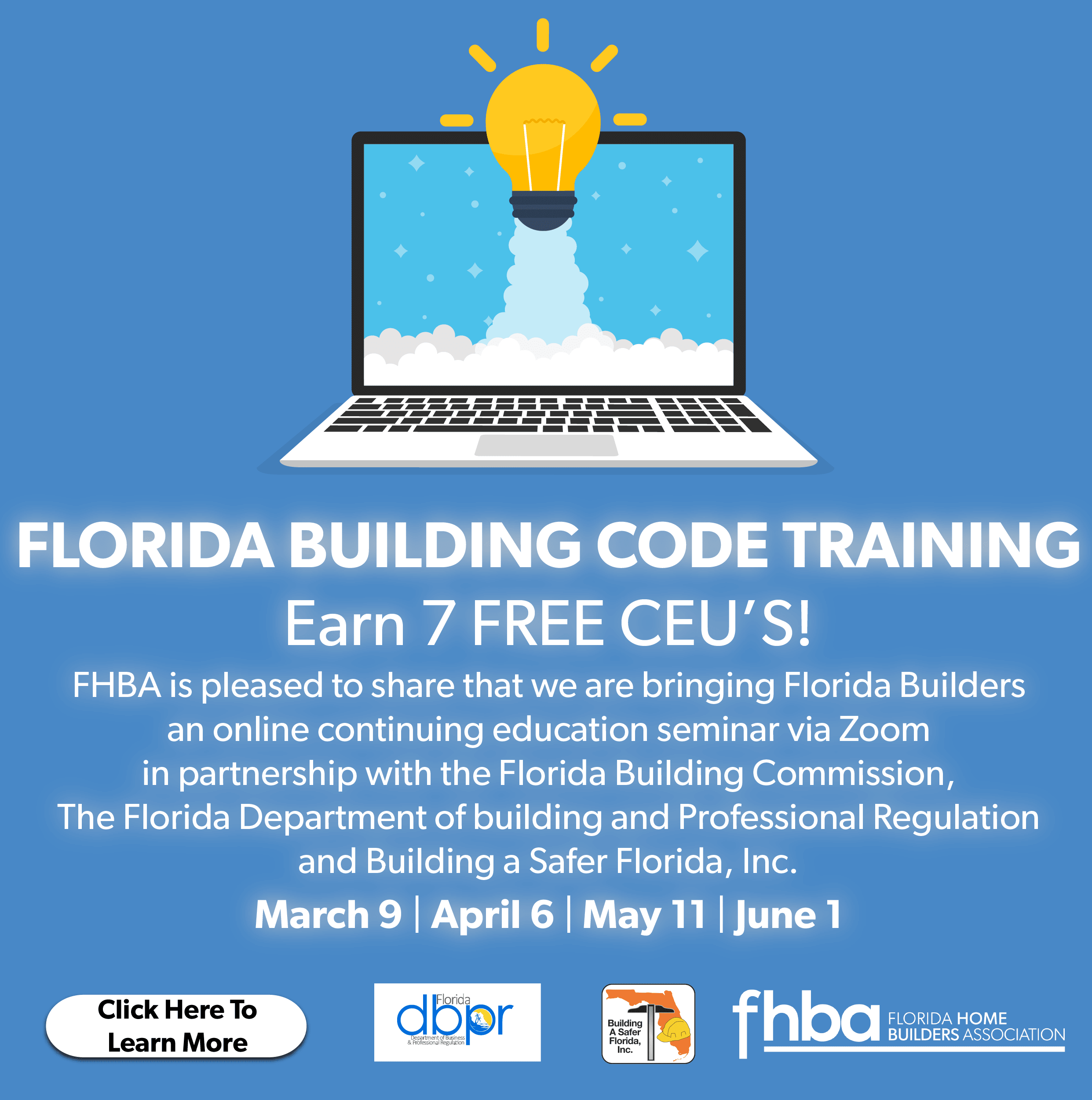Florida Building Code Training: Earn 7 Continuing Education Hours FREE! FHBA is pleased to share that we are bringing Florida Builders an online continuing education seminar via Zoom in partnership with the Florida Building Commission, The Florida Department of building and Professional Regulation and Building a Safer Florida, Inc. The Seminar will feature seven hours of continuing education focused on the Florida Building Code.